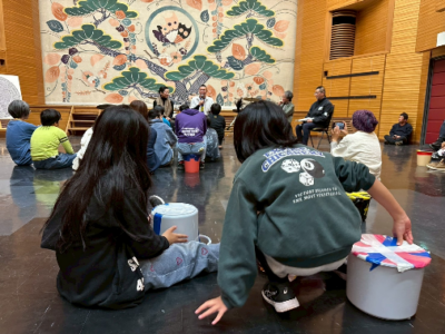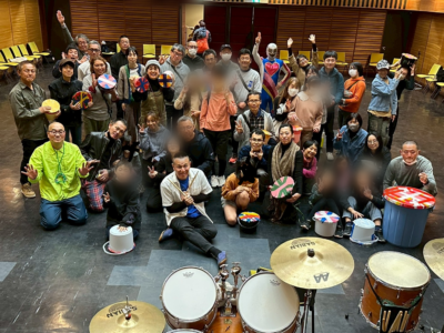 梶原さんの掛け声で、みんなで一斉に太鼓を演奏。続いて梶原さんの迫力あるドラム演奏が始まり、会場は熱気と興奮に包まれました。